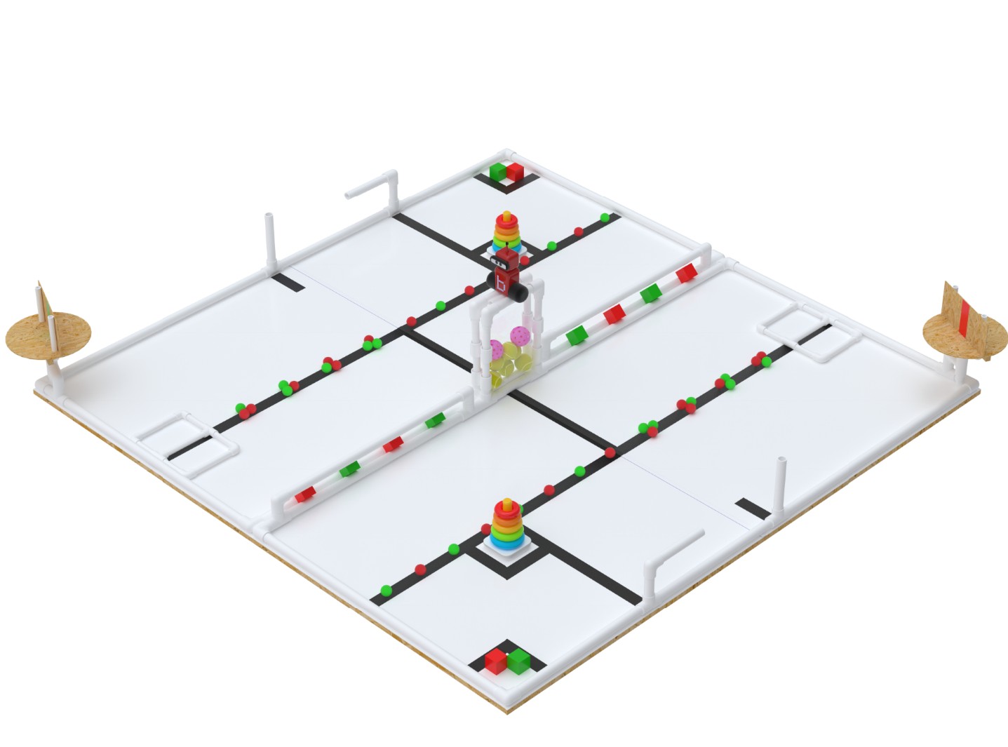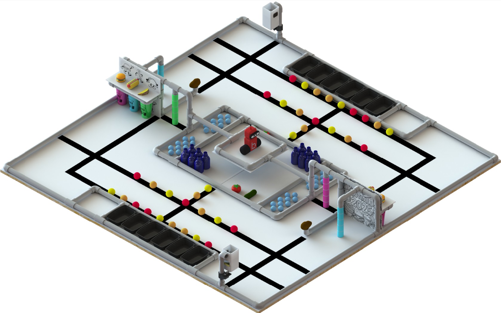 Fast Food – robots gather up Mustard, Ketchup & BBQ sauce (yellow, red & orange poms) and place then in the black food trays. There are drink cups, ice and soda, as well as water bottles to score as well.